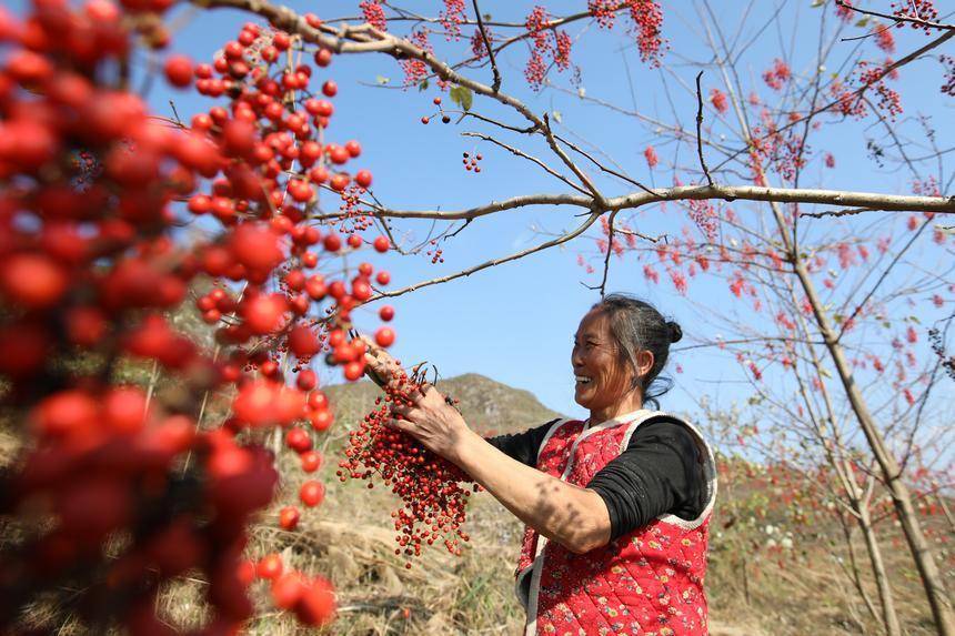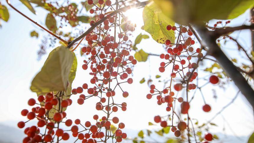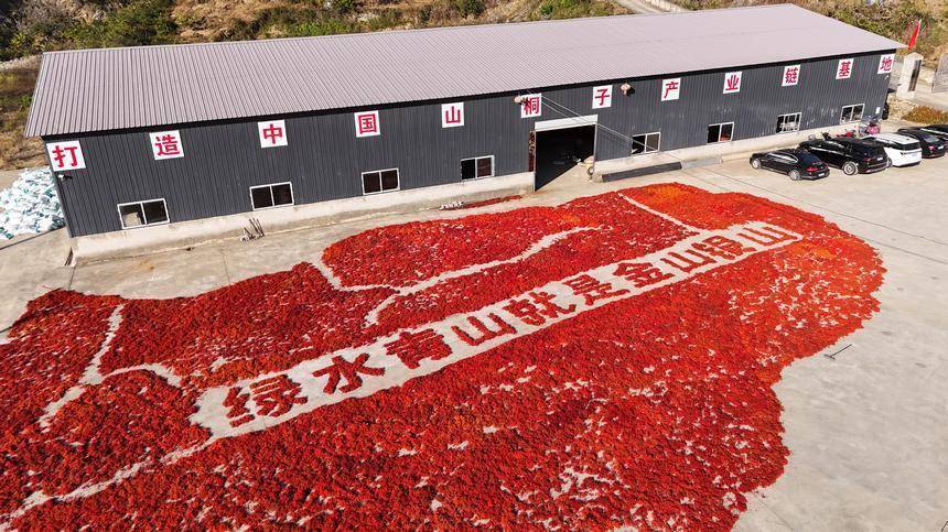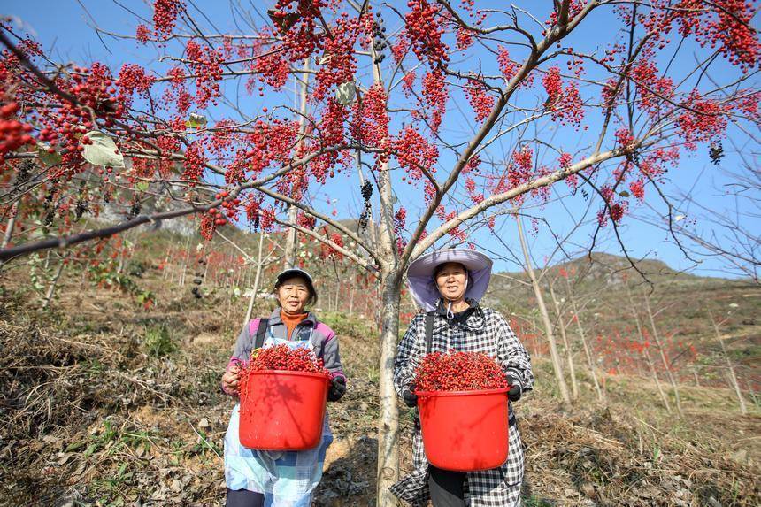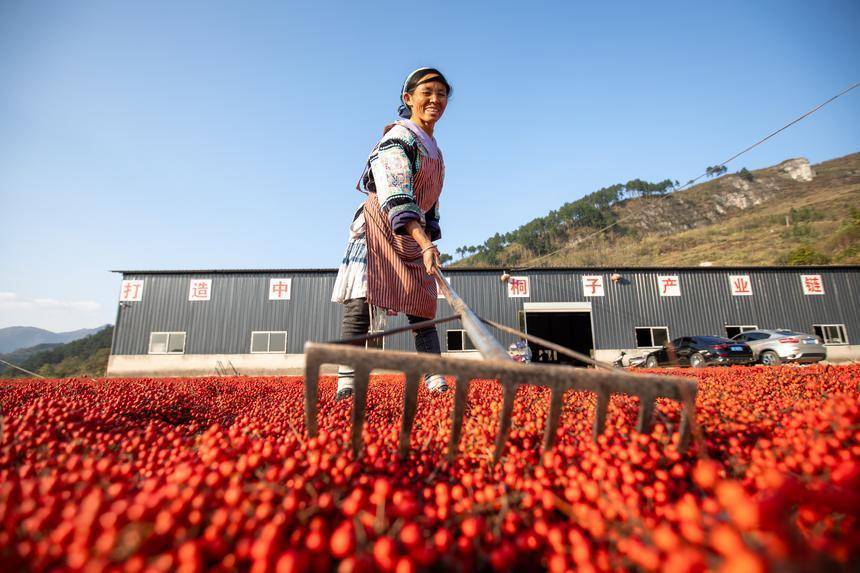 村民在贵州省贵定县宝山街道山桐子基地晾晒山桐子。 石银超摄时下正值山桐子丰收的季节,走进贵州省贵定县的山桐子种植基地,只见一簇簇红艳艳的果实缀满枝头,村民们正忙碌地采摘、晾晒,处处洋溢着热火朝天的丰收喜悦。