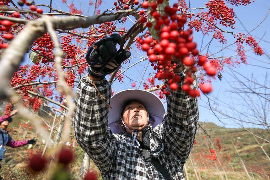 在贵州省贵定县宝山街道山桐子基地里,村民正在采摘山桐子。石银超摄
