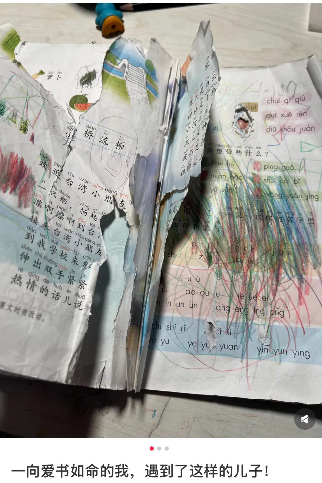 在社交平台上,也有家长分享了自己娃的“战损版”课本,潮新闻记者发现基本集中在低年级且调皮捣蛋的小男孩中——